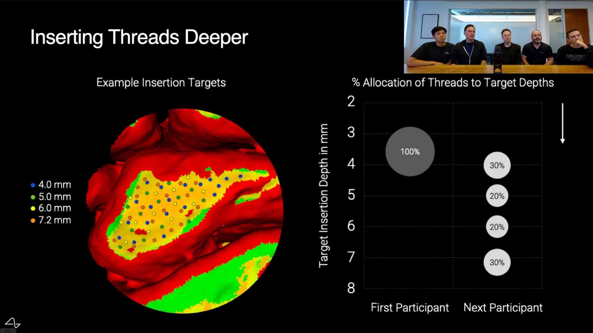 “You may think the most obvious mitigation for threads that pulled out of the brain is to insert them deeper. We think so too. So we’re going to broaden the range of depth to which we insert threads…now that we know retraction is a possibility, we’re going to insert at a variety of depths that even in several cases of different amounts of retracting threads we’re going to have electrodes at the proper depth, and with the deepest threads, be able to track how much retraction has occurred across the surface of the brain from each thread.” - Matthew MacDougall