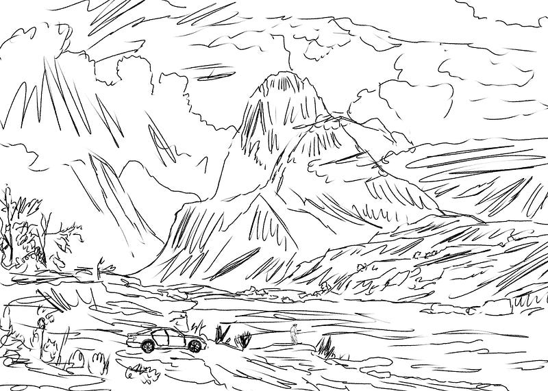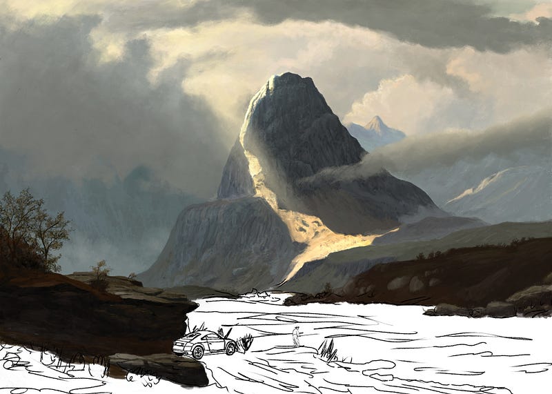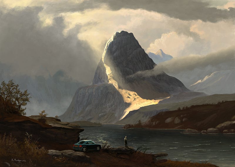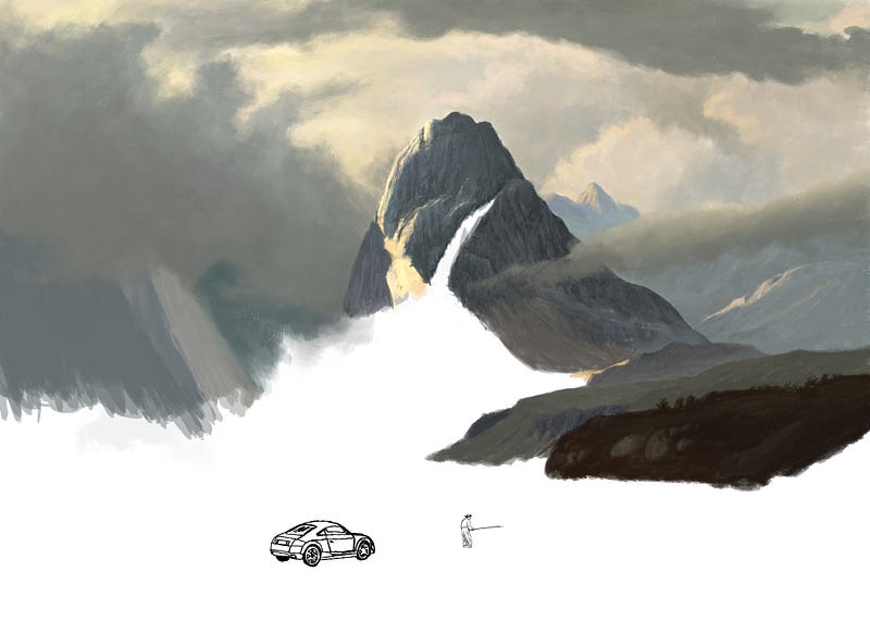 Herewith my second landscape painting in three weeks. The painting was inspired by a good friend of mine who loves the outdoors, as well as his beloved Audi TT. So I thought why not paint a really cool landscape painting featuring him fishing his beloved car?