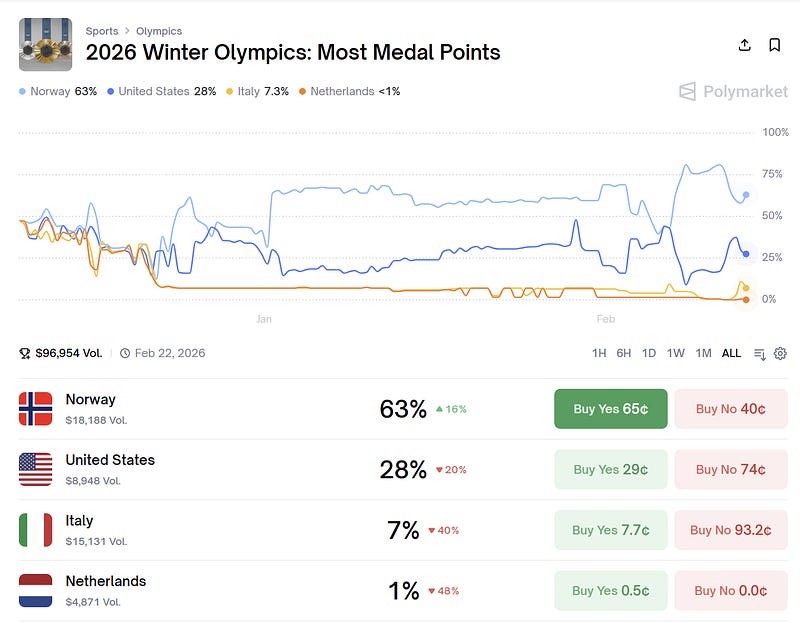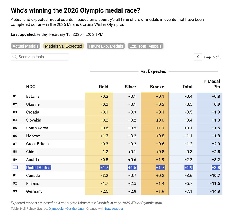 Bad few days for the U.S. — just 2 medals on Feb 12/13, zero gold — has pushed America near the bottom in medal points relative to expected and hurt their Polymarket odds of having the most medal points vs. Norway, who rebounded to add 4 total medals today: polymarket.com/event/20…