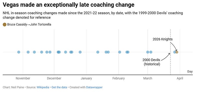 How uncommon is it for an NHL team to fire its coach this late in the season? It hadn’t happened in the past 5 years until Vegas dumped Bruce Cassidy for John Tortorella this week, and you have to go back to the 2000s Devils to find examples of actual playoff-bound teams doing it. (Granted, one of those worked out extremely well!)
