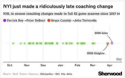 Lol. I refreshed this chart with every coaching change in a full season since 2013-14, and April 5 is EASILY the latest change on the calendar, with Vegas’ March 29 change ranking second-latest.