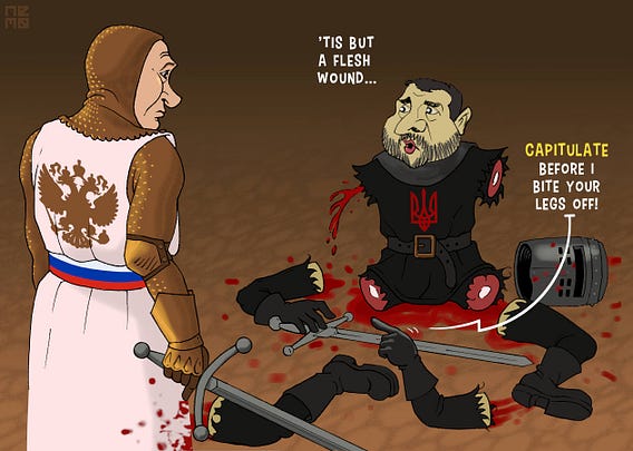 Meanwhile, the Coalition of the Willing losers (UK, France, Germany)… like the Black Night of the Monthy Pythons, they keep posturing aggressively and stubbornly in the face of obvious defeat.