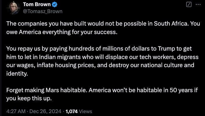 As I’ve stated previously, Musk is either politically retarded or intentionally nefarious. He comes across very poorly in interviews. His Tweets have always been specious, vapid culture war nonsense which distract far more than they enlighten. That’s probably why he was acceptable to the elites. He’s great at marketing and I suppose he’s a great engineer. But he’s not your friend.
