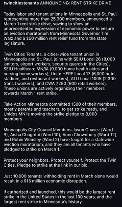 @twincitiestenants | ANNOUNCING: RENT STRIKE DRIVE Today labor and tenant unions in Minneapolis and St. Paul, representing more than 25,900 members, announced... | Instagram