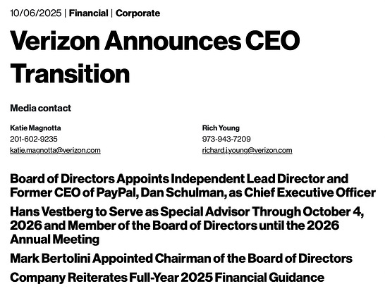 “Verizon today announced that its Board of Directors has appointed Independent Lead Director and former Chief Executive Officer of PayPal Holdings Inc. Dan Schulman as Chief Executive Officer, effective immediately. Mark Bertolini has been elected Chairman of the Verizon Board of Directors. Mr. Vestberg will serve as Special Advisor through October 4, 2026, during which time he will be focused on ensuring a smooth transition including the integration with Frontier Communications, which is expected to close in the first quarter of 2026. Mr. Vestberg will also remain on the Board of Directors until the 2026 Annual Meeting.”