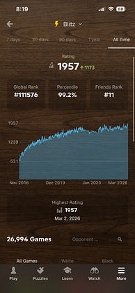 Beginner level players tend to celebrate the 100-point milestones and run out of occasions after a while. Ever since I hit 1800 blitz for the first time three or so years ago on chess.com I’ve felt the weight of every rating point. So here’s a new high for me: 1957. Considering that the previous peak was only five months ago, I’m pleased to have made another small step forward.