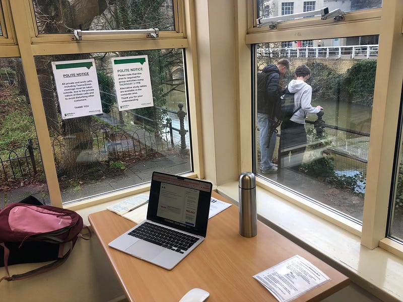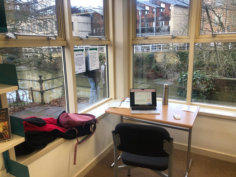 View from the library - Bradford on Avon. Nicest working spot I’ve had - view of the town and river. Warm, cosy and open till 7pm. No Zoom/Teams allowed :)