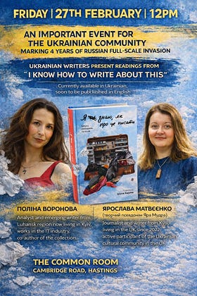 Hastings / 1066 people - I’m going to this tomorrow. ‘I know how to write about this’ readings and Q&A - marking four years of Russian full-scale invasion.