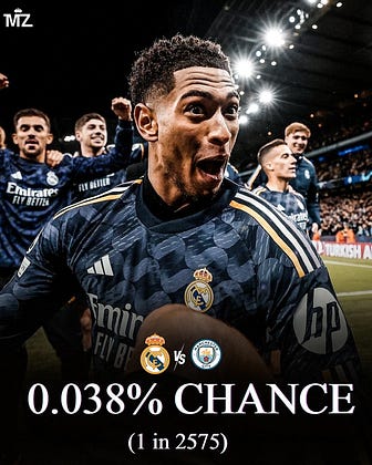 The probability of Real Madrid facing Manchester City in the Champions League 6 times in 7 years is only 0.038%! @perplexity_ai