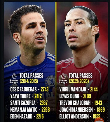 The Premier League top passers in 2014/15 vs 2025/26