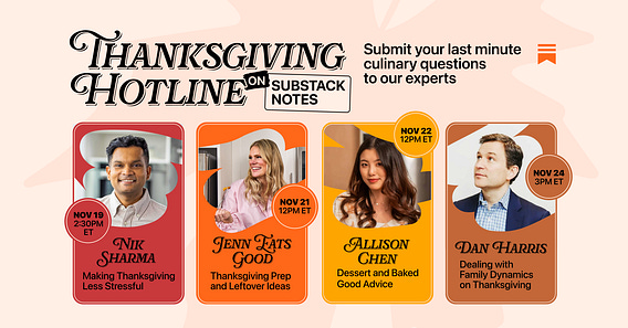 We’re hosting four Q&As on Notes this week with Substackers who can help you nail the holiday. Drop by to ask your questions and get answers from Nik Sharma, Jenn Lueke, Allison Chen, and Dan Harris, right here in your Notes feed.