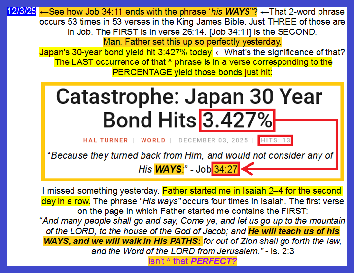 The headline of the most recent article Hal Turner has posted to his site thus far today declares that Japan’s 30-year bond yield has hit 3.427%. ←I didn’t know yesterday that that number would come up this morning, nor that it would confirm in spectacular fashion what Father led me to write back in June, but Father did. And He set the table for this 2 days ago. I’ll let the attached pics tell the REST of the story.