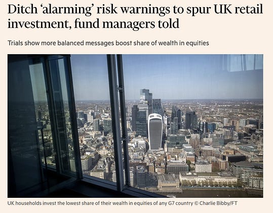 Astonishing… I’m probably missing some nuance here, but this piece in the Financial Times reads like the UK wants less emphasis on financial product risk warnings because that leads savers to invest less?