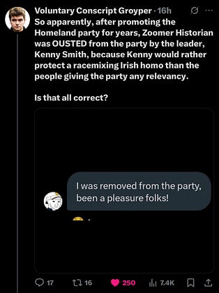 The British youtuber ZoomerHistorian was apparently kicked out of the Homeland Party over the weekend. ZoomerHistorian isn't a particularly abrasive character, he makes youtube videos about “revisionist” history. He clearly isn't NS, but can be considered similar to British figures like Oswald Moseley or Enoch Powell. Meaning, he's a mod…