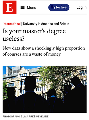 The Economist wrote a piece showing that master degrees are useless since there is no financial reward.