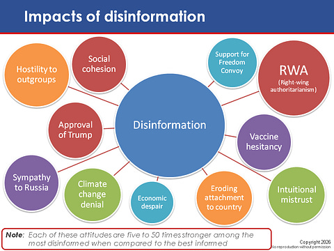 EKOS finds that these attitudes can be five to fifty times more prevalent among the most disinformed Canadians compared to the best informed. That gap matters. It helps explain growing polarization, declining social cohesion, and why foreign and domestic disinformation campaigns focus less on persuasion and more on erosion. Trust, belonging, and shared reality are the real targets.