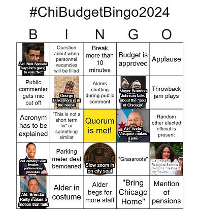 Hey! Right now I’m live-tweeting City Bureau’s Budget Bingo for the 2024 Chicago City Council Meeting Budget Final Vote