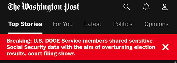 Jesus Christ they went and hacked our private Social Security data and then shared it externally because a DOGE employee had a secret deal with a private pro-Trump PAC to try and illegally obtain enough data to overturn election results.