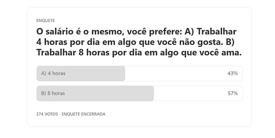 Perguntei lá na news: se o salário fosse o mesmo, elas iriam preferir, trabalhar 4 horas no que não gostam ou 8 horas com o que gostam.