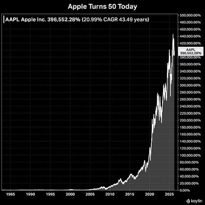Apple turned 50 today, here's their lifetime returns since IPO, more than 43 years ago.