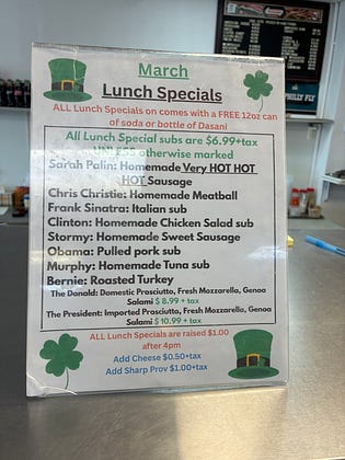 I was a political science and women’s studies double major but I still couldn’t quite tell which way this deli sandwich specials listing leaned in our purple district so I didn’t buy anything. Any ideas on interpretations? I’m assuming they are right wing but truly wasn’t sure. Sarah Palin (um, hi, it’s 2026!) is hot?? It’s from an Italian market in Galloway, New Jersey. I don’t know the deli name because I just wandered in but it’s near Santori’s.