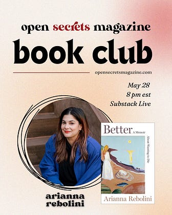 May is Mental Health Awareness Month, so the Open Secrets Book Club is reading Better: A Memoir About Wanting to Die by Arianna Rebolini. Our editor-in-chief Rachel Kramer Bussel will interview Arianna Substack Live on May 28 at 8 p.m. ET. Read the book and bring your questions!