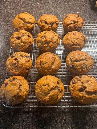 Today it’s banana choco-chip walnut muffins with added pecans.