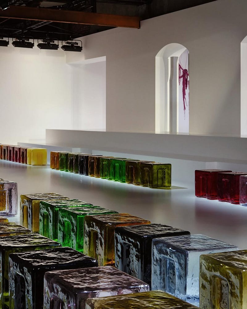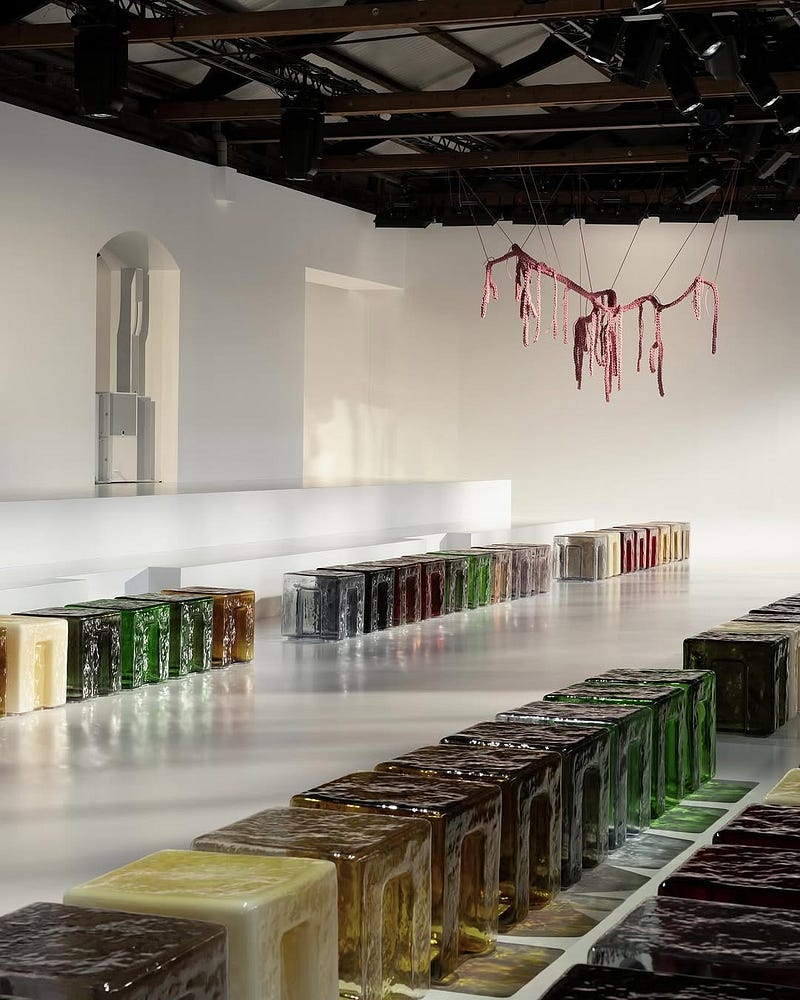 For Louise Trotter's Bottega Veneta SS26 debut: a candy-like Murano glass seating system by 6:AM — cast iron moulds, CNC-engraved to ripple like sea waves.
