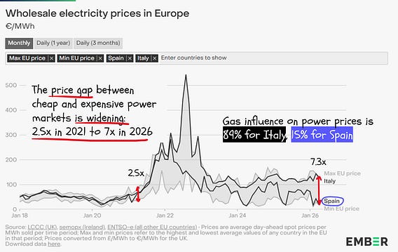 Electricity in Spain now costs 7x less than in Italy. And the gap is widening.