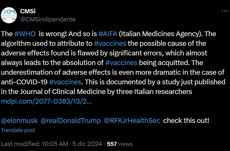 On January 9th, the X account @cmsindipendente, belonging to the Independent Medical Scientific Commission (cmsindipendente.it) which I am part of, was deactivated. This action appears to have been triggered by a post referencing a peer-reviewed study published in a scientific journal (mdpi.com/2077-0383/13/2…). This situation prompts a critical question: Is X genuinely the uncensored platform that Elon Musk promised to the world?
