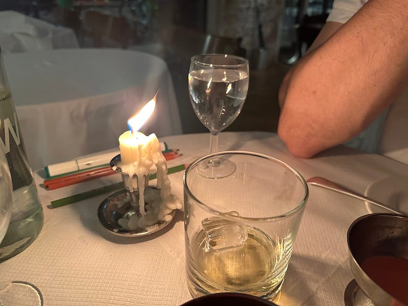 There are noteworthy touches to admire: mismatched hand picked antique silver cutlery to the bubble wrap trompe l’oeil chandelier, the encouragement to be creative with colouring pencils and felt tips offered to draw on the table cloths, the long candlesticks that are left to drip onto the table (romantic) and are replenished once entering the danger stub zone (thoughtful)