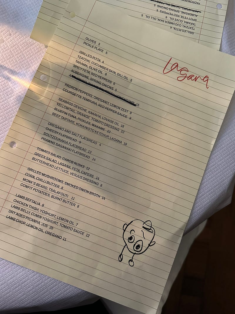 To me, Lagana sits within the seams of the Athenian neo taverna scene, with references to Pharaoh, LS&Sia and Ton Filon, a sprinkling of the silliness of Wine is Fine, along with a nod to the local gloss spot Bistro Freddie and the playful romance of Sessions Arts Club