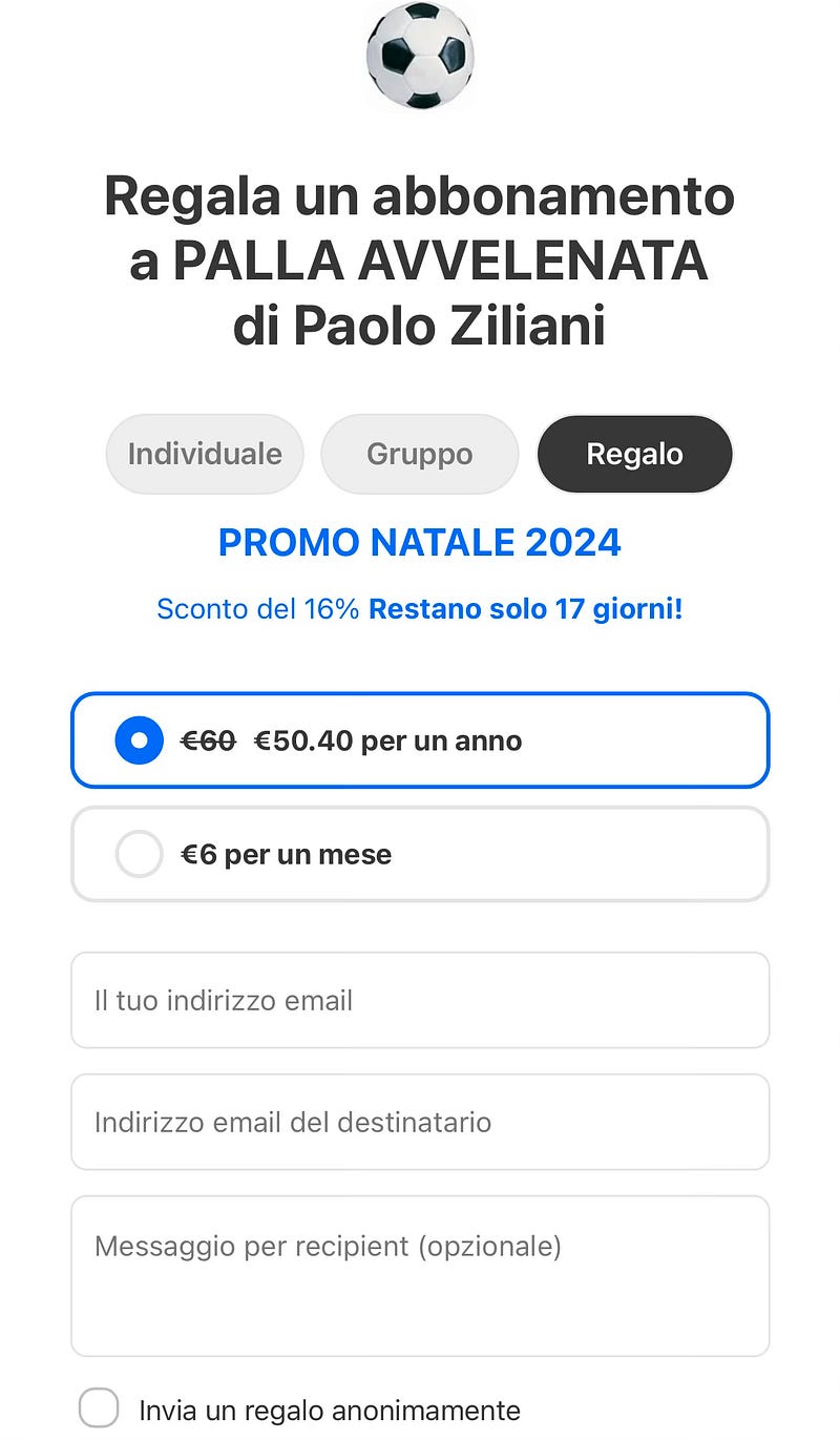 Se mi conosci, sai come lavoro e come la mia sia una voce libera e fuori dal coro e vuoi farti un regalo (o fare un regalo) che duri non il breve spazio di un giorno ma un anno intero, quello di leggere i miei articoli di denuncia e di verità sul calcio che non leggerai da nessuna altra parte, abbonati o regala un abbonamento annuale al mio account Substack “Palla Avvelenata”: fino al 6 gennaio c’è lo sconto da 60 a 50 euro sull’abbonamento annuale. t.co/VXSlC4lzFk Ti prometto - ma già lo sai - che non leggerai mai una velina di Palazzo, nessuna favola di Alice nel Pese delle Meraviglie, ma solo e sempre la verità delle cose. (E se non conosci il mio account t.co/VXSlC4lzFk, perdi due minuti di tempo e vai a dargli un’occhiata: l’ho aperto da poco più di un anno e mi seguono già in tantissimi). t.co/VXSlC4lzFk