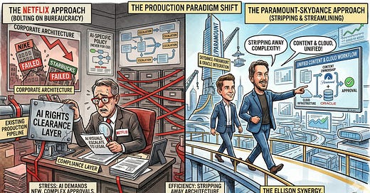 Last October Netflix published a formal legal rulebook for AI that it never wrote for Photoshop or CGI. Instead of stripping architecture, Netflix is adding it—bolting a legal compliance layer onto its existing production pipeline. Paramount Skydance is doing the opposite, another reason the Ellisons are positioned to win with their bet on the cloud.