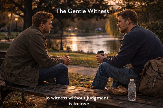 I sat with a stranger once on a park bench. He spoke of regrets, voice low. I did not advise or console. I simply witnessed—eyes soft, body still, heart open. When he finished, he looked lighter. Nothing had been fixed, yet something had been met.