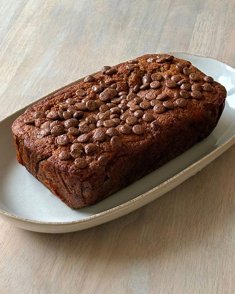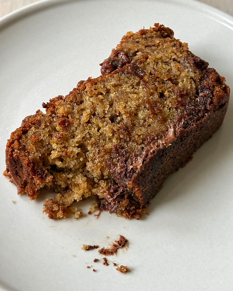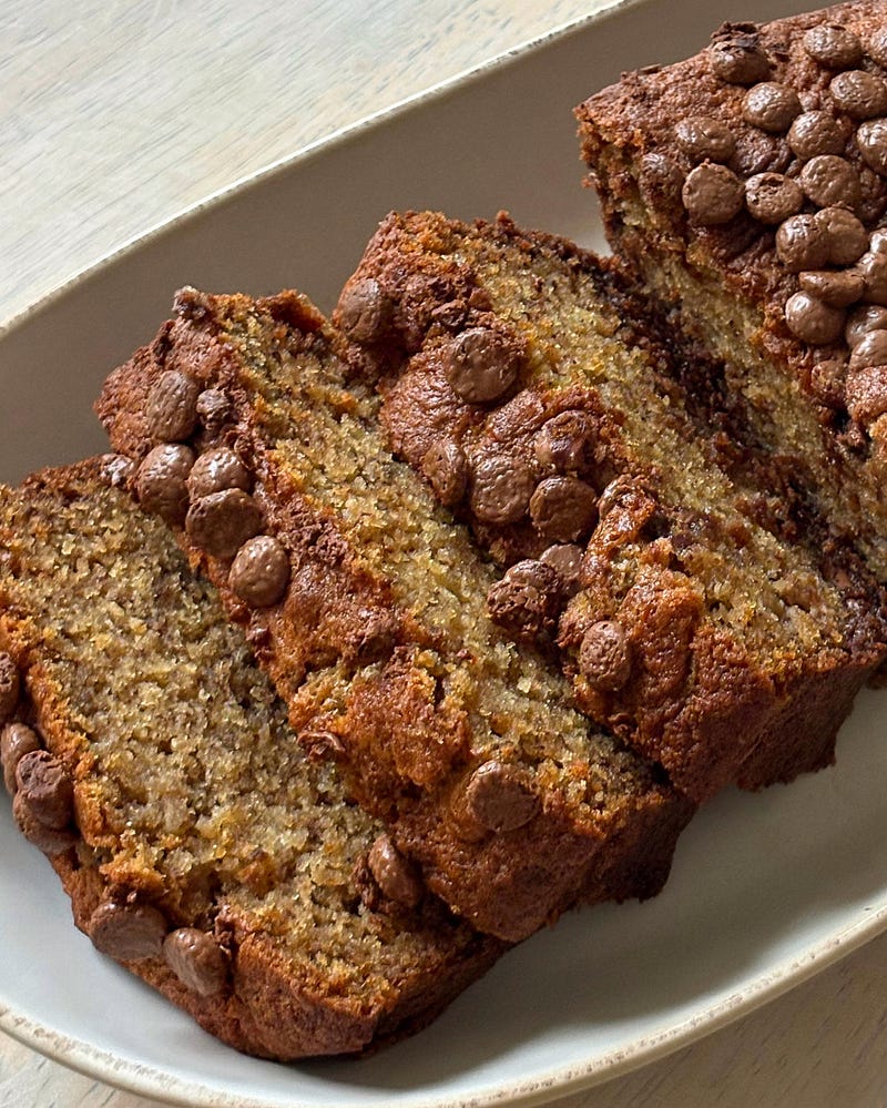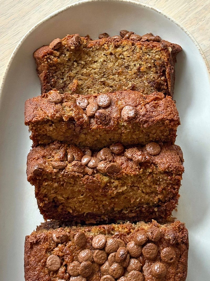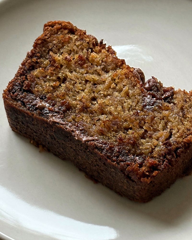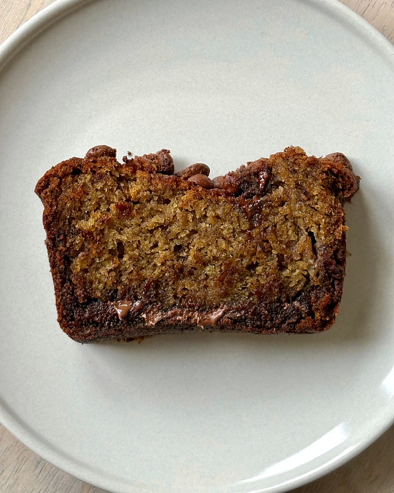 Brown butter chai-spiced chocolate chunk banana loaf. Made with Greek yogurt and olive oil for the softest, moist aromatic crumb with gooey chocolatey pockets throughout. Your kitchen will smell deliciously fragrant after baking this. Recipe is posted!