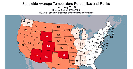 The entire western half of the country was historically warm in February — Arizona, Nevada, Texas, and Colorado all ranked as the warmest on record over 132 years. Dry conditions across the same geography kept consumers moving.