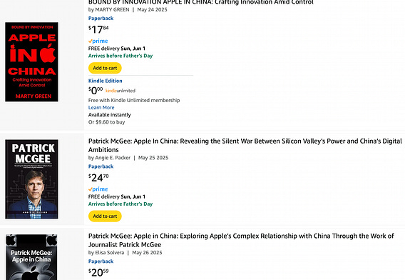 Since I wrote about the book Apple in China today, I note that since it became a best-seller, a forest of shitty AI-written knockoff books have appeared on Amazon. These are only the top 3: