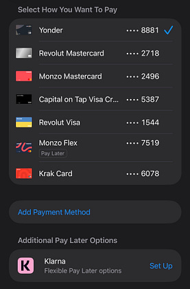 When selecting a card for an Apple Pay payment I couldn’t help but notice the Klarna option at the bottom of the page.
