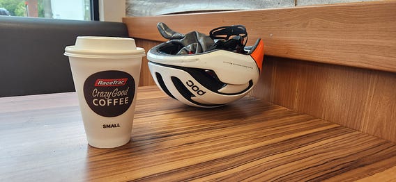 82+ miles into for the day. Only 10 miles yet to go! Quick gas station coffee before facing the fierce head wind that snuck up on me this afternoon. Head down, keep peddling.