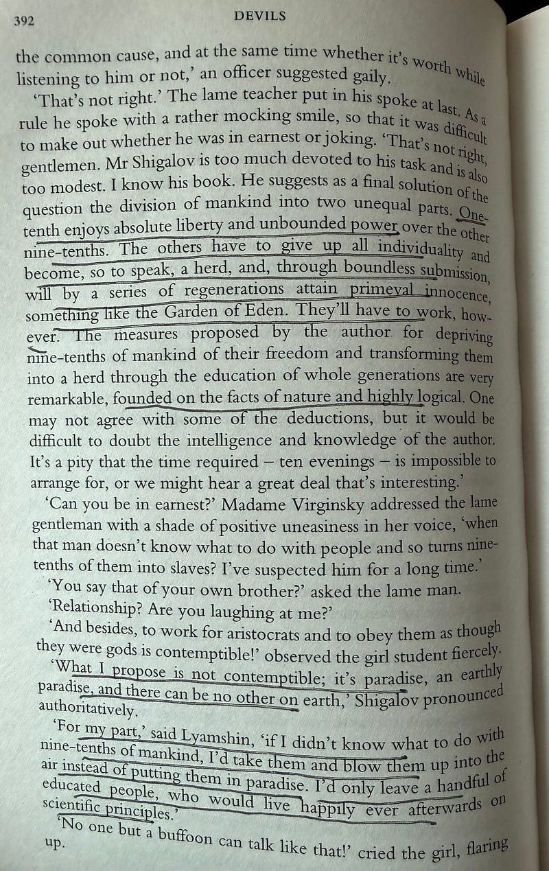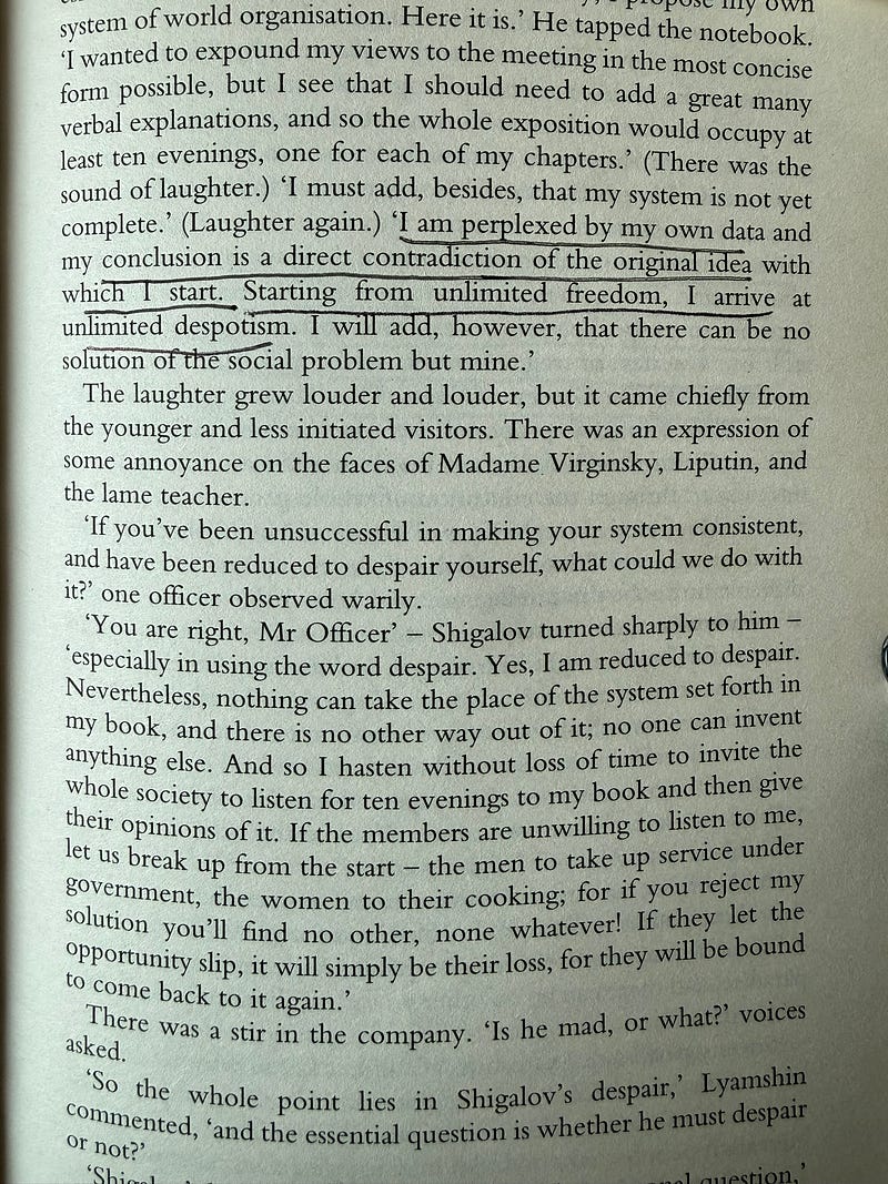 Dostoevsky (1872): "Starting from unlimited freedom, I arrive at unlimited despotism." Radical equality requires enforcement; power concentrates in enforcers. Dostoevsky predicted the reality of communism 50 years before Lenin—a vanguard transforming the masses into livestock.