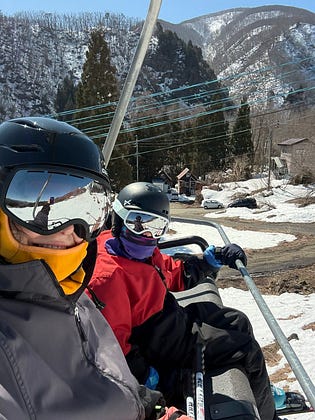 I don’t love chair lifts or gondolas. But it’s pretty special riding in the air in the mountains with my kids. Sol brought a mini strawberry Kit Kat for us to share up here (Japanese speciality).