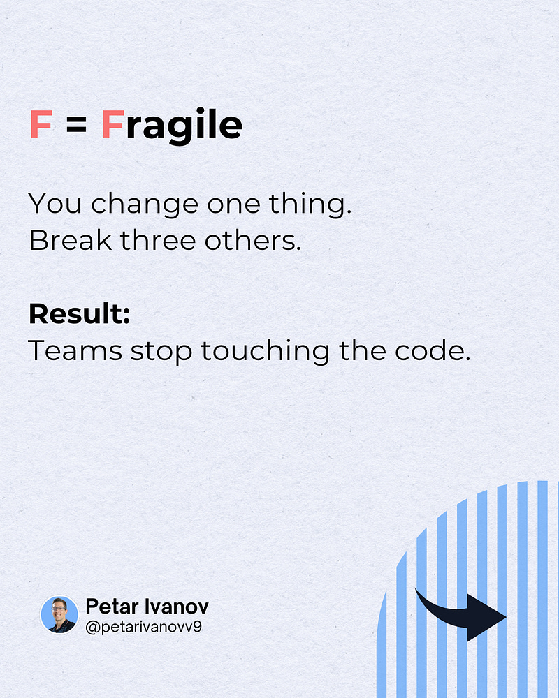 ↳ small changes break other features, causing many bugs; teams start to fear making changes in the code.