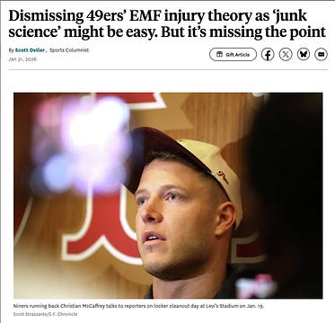I was not a journalist when I broke the story about the electrical substation adjacent to the 49ers training facilities. I was just an EMF consultant, with a theory I had developed from my clinical work, and a gauss meter and a lot of curiosity. I had a mechanism that nobody in sports media was talking about, and it struck a nerve, going viral, and becoming an international news event — drawing out responses from the 49ers players, the GM, and ownership, prompting discussion across the NFL, and eventually going all the way up to the Commissioner's office.