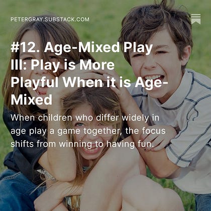 WHEN CHILDREN who are all nearly the same age play a game, competitiveness can interfere with playfulness. This is especially true in our current culture, which puts so much emphasis on winning and comparisons aimed at determining who is better, an emphasis fostered by our competitive school system and our habit of putting even young children into competitive sports and contests. ... In contrast, when children who differ widely in age play a game together, the focus shifts from winning to having fun. CLICK HERE FOR MORE.