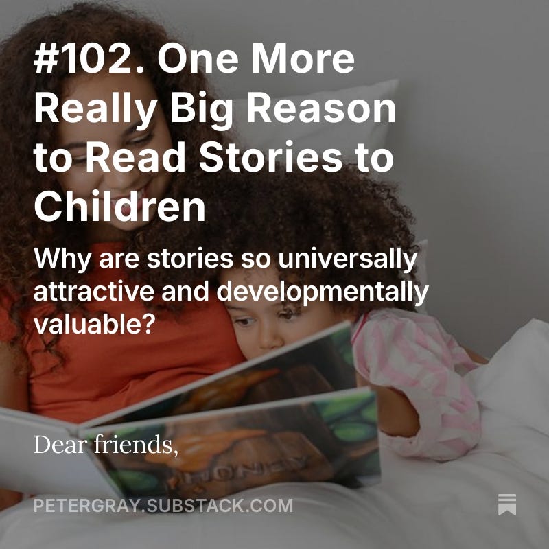 THERE ARE many good reasons to read to children. But here I focus on a reason that is not so often touched on. It may be the most important one of all. Indeed, this reason gets at the heart of why human beings everywhere are attracted to fiction and why that attraction begins to appear so early in childhood. The reason is this: CLICK HERE: