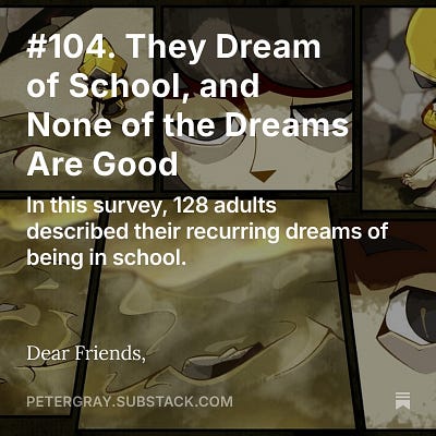 NONE of the 128 people who responded to the survey described their recurring dreams of school as pleasant. For some, they were more than unpleasant; they induced panic or something close to it. Here are a few examples: • I wander around, panicked, looking for the correct classroom, I dread having the teacher lay into me about missing classes• The feeling is extreme anxiety, embarrassment, and shame.• [I am] completely freaked out that I know nothing and am going to fail the class. The feeling of not knowing and of impending failure is so intensely gut-wrenching.• I wake up with my heart pounding every time.• But then, all of a sudden, there even popped up a whole new subject about which I hadn't been informed. ...I am panicking, I am in agony; all I have studied for, all the hard work was in vain, no degree.For more, CLICK HERE: petergray.substack.com/…