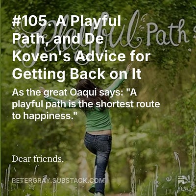 IN DE KOVEN'S WORDS: “You don’t have to play to be playful. You don’t need toys or games or costumes or joke books. But you do have to be open, vulnerable, you do have to let go… Playfulness is all about being vulnerable, responsive, yielding to the moment… You are loose. Responsive. Present. You have to be present to enjoy the sunrise, to delight in the light of your child’s delight, because otherwise you simply aren’t there to catch it. It goes by you as if it and you aren’t even there.” CLICK HERE: petergray.substack.com/…