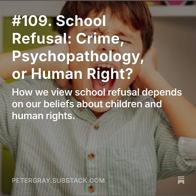 MAYBE, at least to some degree, the school refusers are the courageous ones. Refusing school takes more than a recognition that the world is unjust and that you are being treated unjustly in school and that you experience anxiety at the thought of it. It also takes courage, especially when the injustice that you see is viewed as normal and reasonable by everyone around you. CLICK HERE: petergray.substack.com/…