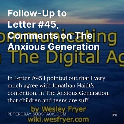 IN LETTER #45 I POINTED OUT that I very much agree with Jonathan Haidt’s contention, in The Anxious Generation, that children and teens are suffering because they have been deprived of free play and other independent activity but disagree that social media or other uses of digital devices are a major cause of the recent increase in anxiety, depression, and suicide. And I reviewed the reasons for my disagreement. ...The letter drew many thoughtful comments, all of which I appreciate. What I want to do now is respond briefly to what I found to be the most interesting and, in some cases, provocative comments. CLICK HERE: petergray.substack.com/…